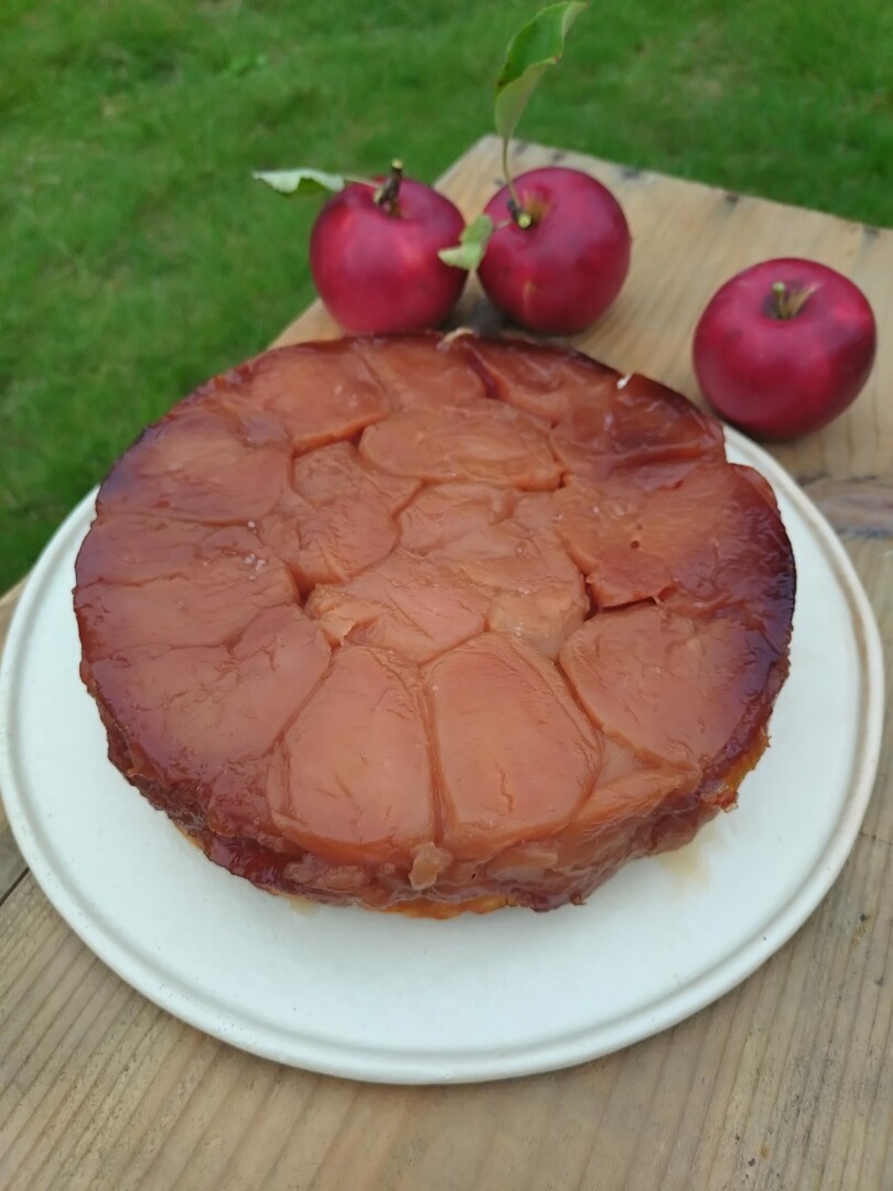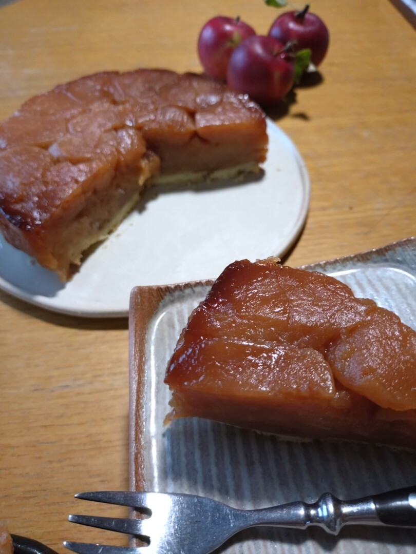とっても贅沢な気分です。なんてったって年に一度のタルトタタン!柔くなっていたリンゴを使ったので、グズグズ感がありカットするのも恐ろしい。形が崩れそうです。食べる前に庭にリンゴ箱を用意して、葉っぱ付きのリンゴを置いて撮影。皿は学のプレートです。リンゴを1800グラムも使っているんですから贅沢ですよね~。難を言うならいつも買っていた紅玉の方が美味しかったかも……。