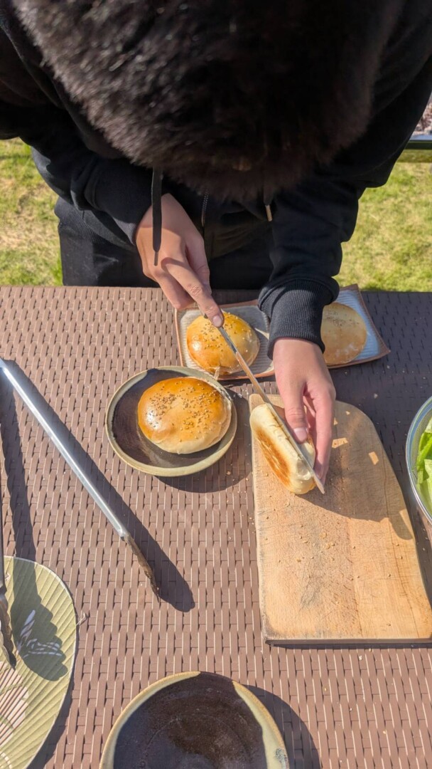 久々に孫達家族が遊びに来ました。夏休み以来です。こちらとあちらの都合がなかなか合わなくて今日になりました。2ヶ月ぶりくらいかな〜?6年生の閃ちゃんの身長が……伸びていた。目線が近くなってきた!161cmだそうです。165cmに縮んでしまった私は😅もうすぐ追いつかれそうです。この時期の成長の早さは凄い!成長痛がそろそろ始まりそう。閃太郎のリクエストでハンバーガー🍔を作って食べるというイベントです。お天気最高!山盛りバンズを焼いて、合い挽き肉でパティを作りトッピングの食材を準備しました。庭にテーブルを出してBBQコンロで、パティとパンを焼く。閃太郎がバンズをスライスしてくれました。