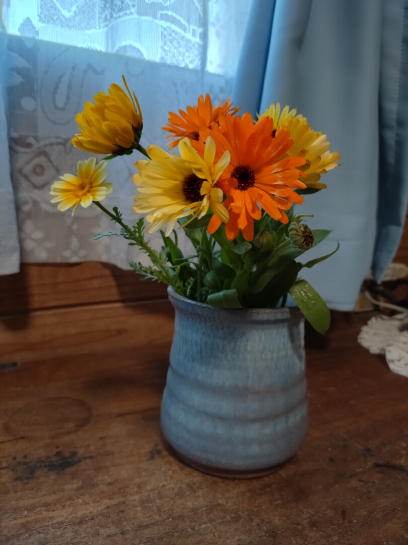 そろそろ花たちも終わりですね。草を引っこ抜く前に花を摘んできて窯変釉の器に投げ入れ〜可愛い〜!部屋がぱっと明るくなりました〜!