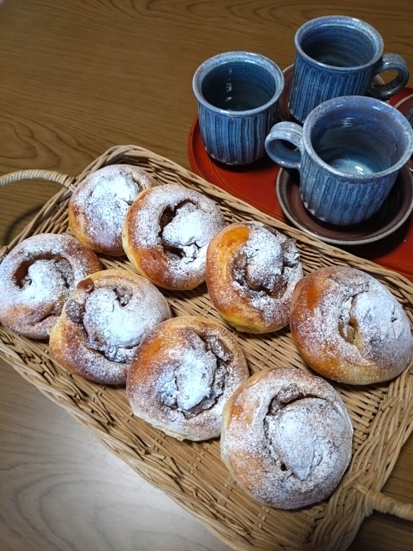 リンゴ入りシナモンロールを焼きました。アイシングをする予定でしたが、粉砂糖が少なすぎて振り掛けただけにしました。