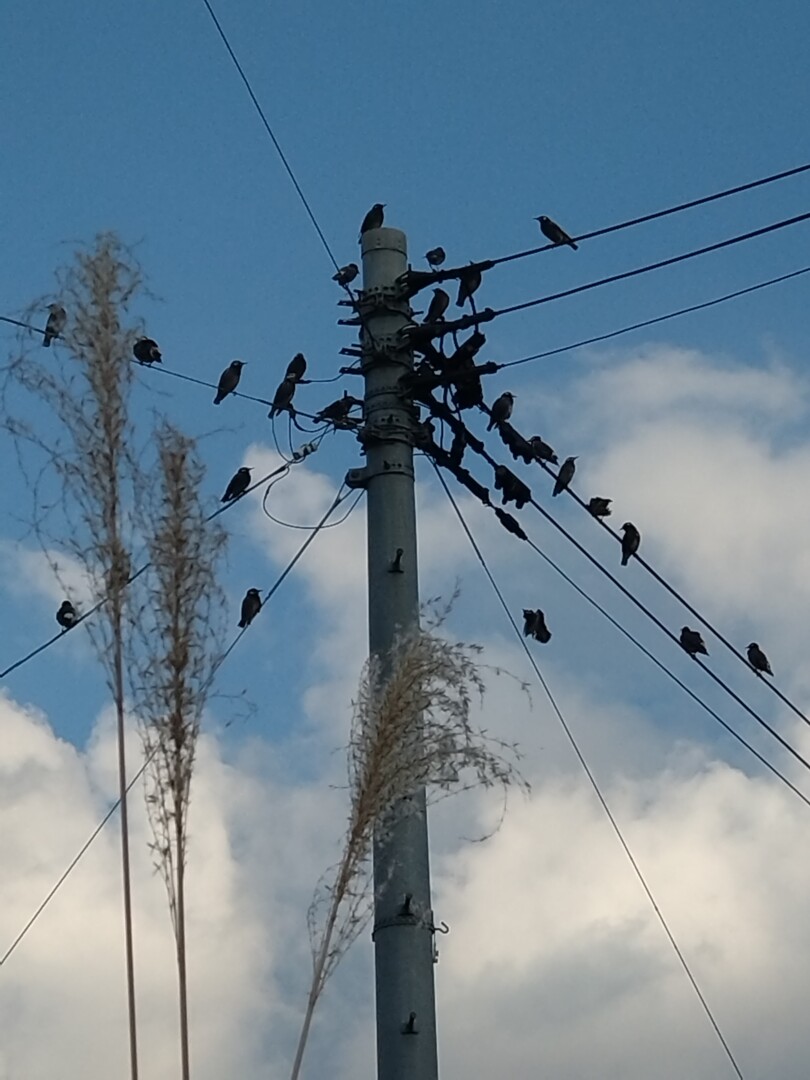 今日もいろいろやることがいっぱ〜い。郵便局に用事があった。往復10分。ちょっとした散歩。途中電信柱に鳥が。ムクドリかな〜?