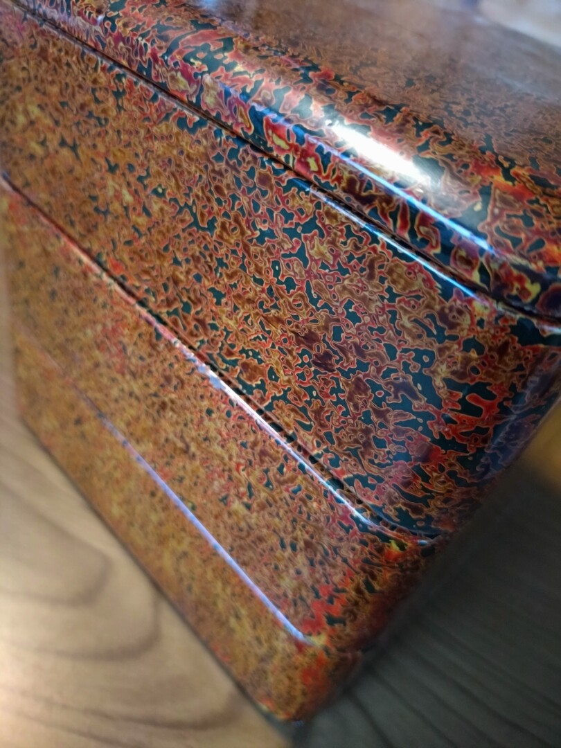 うちのは一回り小さな使い込んだ津軽塗の御重。お煮〆が入りきれませんでした。