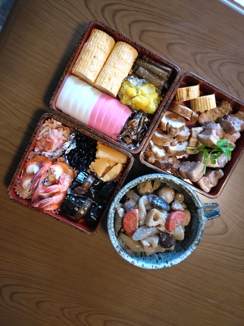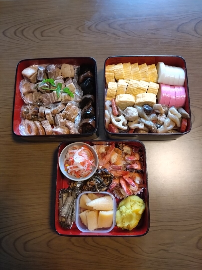 詰め合わせが済みホッとしていたのですが、なんと黒豆が入ってない💦!すでに余白がない。さて〜?別容器に入れて持たせることにしました。昆布巻、数の子、黒豆、栗きんとん、紅白なます、田作り、ごぼう、海老の煮物、筑前煮、八幡巻き、豚角煮、蒲鉾、だし巻き卵、以上。我が家は甘い伊達巻が苦手なのでだし巻き卵です。今年の数の子は北海道産!ポリポリ美味しい。田作り失敗。あめのタレが多すぎてベトベトに。後は何とか仕上がりました。何歳までつくれるかな〜?材料費がかかりますから今時出来合いを買ったほうが安上がりですね。手間、燃料費……愛情だけですね。次男家族の御重、今年から大きいものにました。食べ盛りが2人いる!!