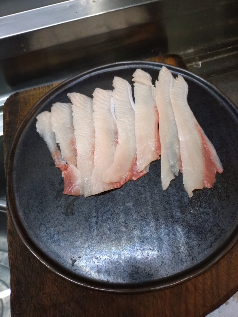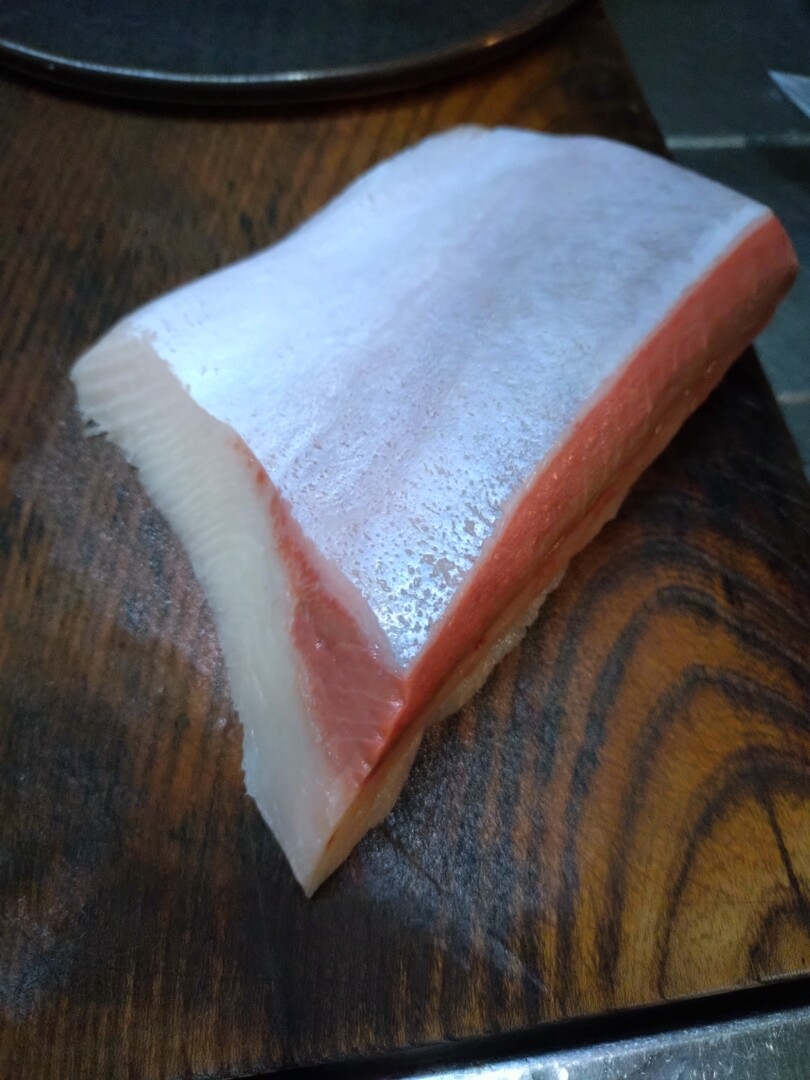 当然脂が乗った「腹身」を選びます。4〜5㍉の厚さに包丁を寝せて引いて切ります。おっとその前に包丁を研がねばならない!