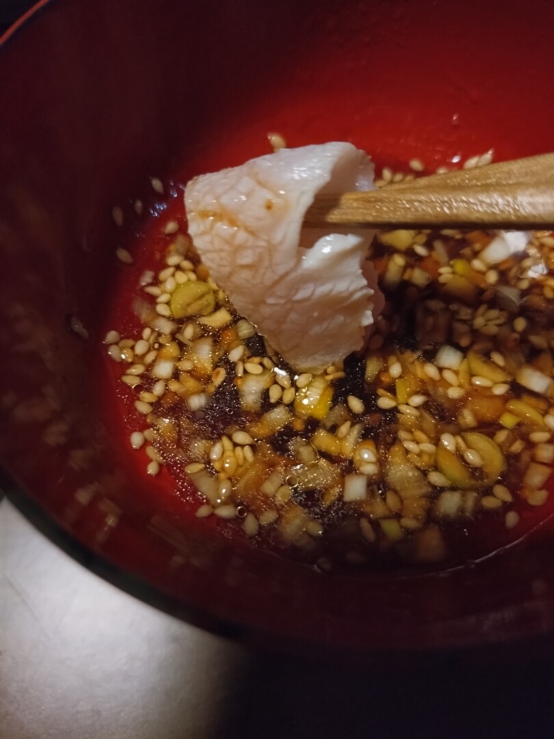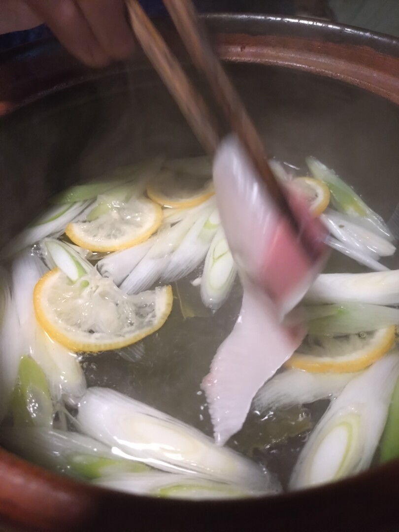 盛り付けは……まぁこんなもんですよ。タレを作らなくては。ポン酢にネギのみじん切り、ごま油、白ごまを入れて混ぜ混ぜ。もう一つピリ辛タレ。酒、水、甜麺醤、豆板醤、砂糖を混ぜ混ぜ。さぁ土鍋を準備して酒をドバドバ5合ほど入れる。昆布を入れて沸騰させる。水は一滴も入れません。ゴージャス!ネギを斜め切りに、柚子のスライスも。鍋の中に入ったら〜
