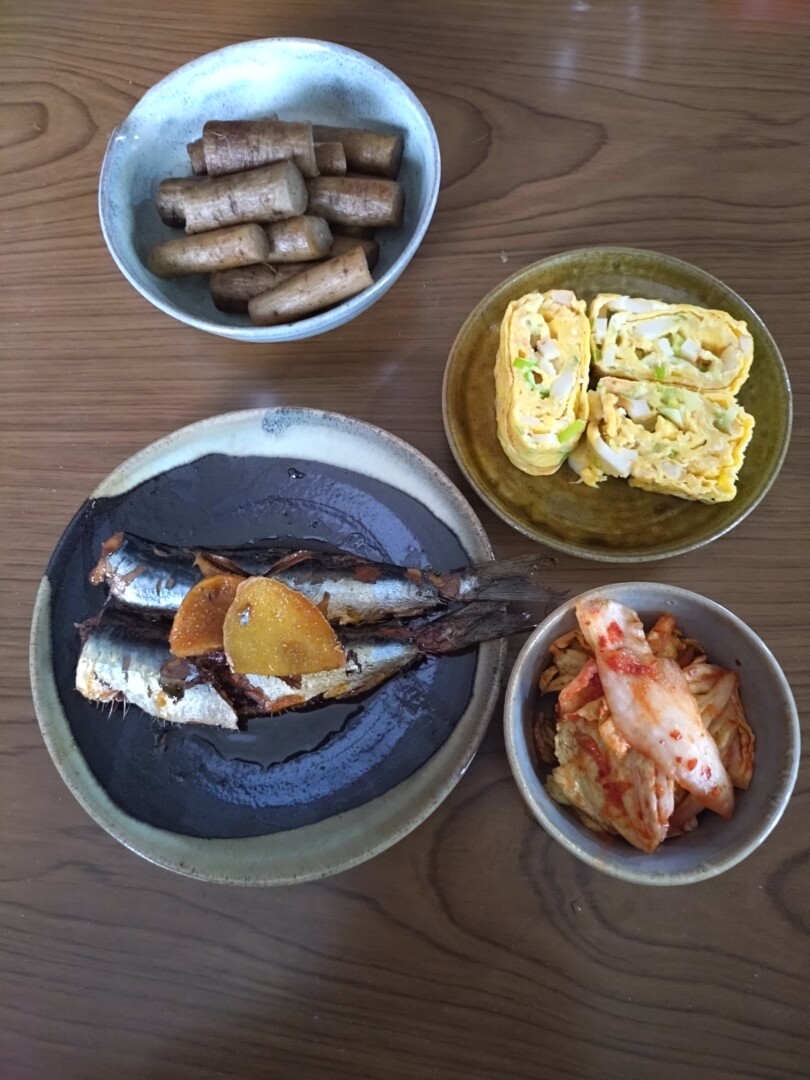 ⇩本日のお昼ご飯。イワシの煮付け。ゴボウの煮物。ネギ入り卵焼き。キムチ。ご飯に味噌汁。一応和食つくってます。