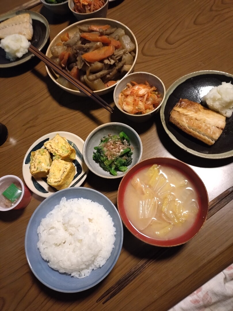 焼鯖大根おろし付き。菜花のおひたし。卵焼き。キムチ。根菜の煮物。味噌汁。ご飯。