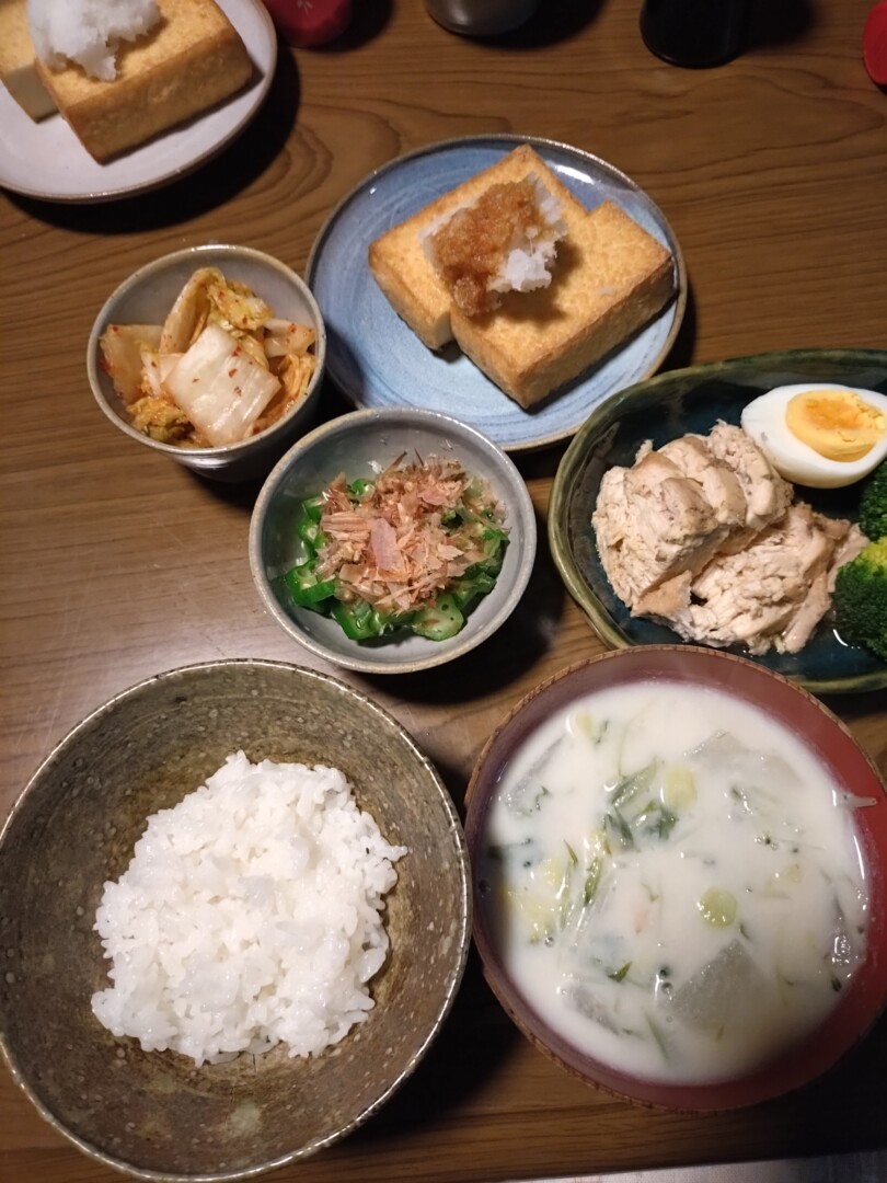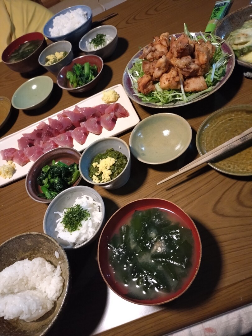 鰹の刺身。鶏唐揚げ。めかぶ酢。山芋。ワカメの味噌汁。ご飯。唐揚げ余計だったかも。昨夜の晩ご飯。⇩