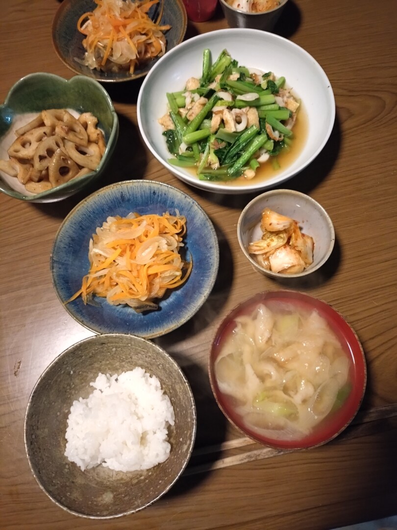 なんだか野菜ばっかり。ニンジンと玉ねぎの下に塩鯖の唐揚げが隠れている。鯖の南蛮漬け。レンコンの炒め物。小松菜の煮びたし。自家製キムチ。具だくさん味噌汁。その次の日の夕食。⇩